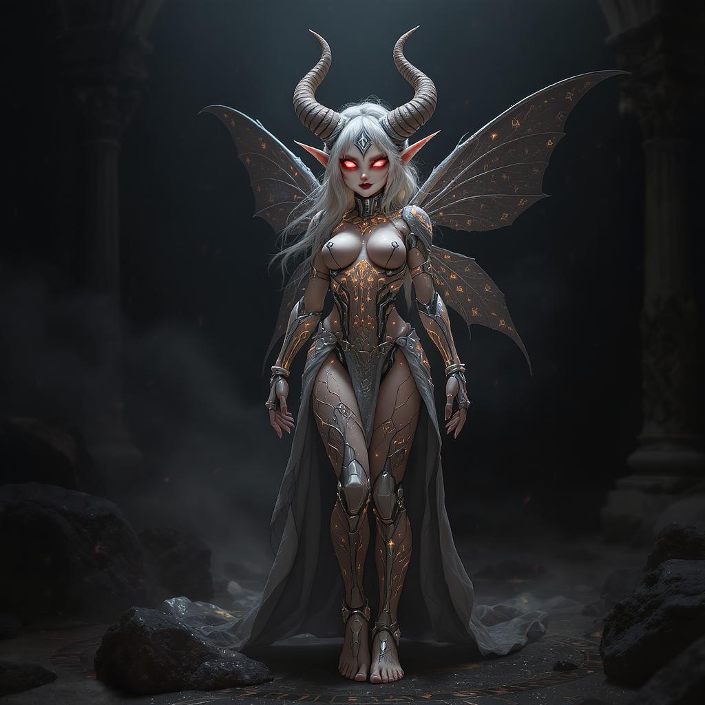 A surreal black light poster of a detailed portrait of a breathtaking cyberpunk elven pixie cyborg hybrid, shown barefoot with a full-body perspective. This captivating creature exudes an irresistibly cute appearance while hiding a devilishly sinister soul, embodying the dichotomy of good and evil. The design seamlessly blends elements of demonangel and white witchcraft, achieving a hyper-realistic and exquisitely detailed composition. The image is crafted with stunning precision, featuring dramatic cinematic lighting that enhances the hyper-emotional impact of the scene. The intricate design is enriched with meticulous details, capturing a sense of otherworldly allure, rendered in 8k quality for maximum visual impact.