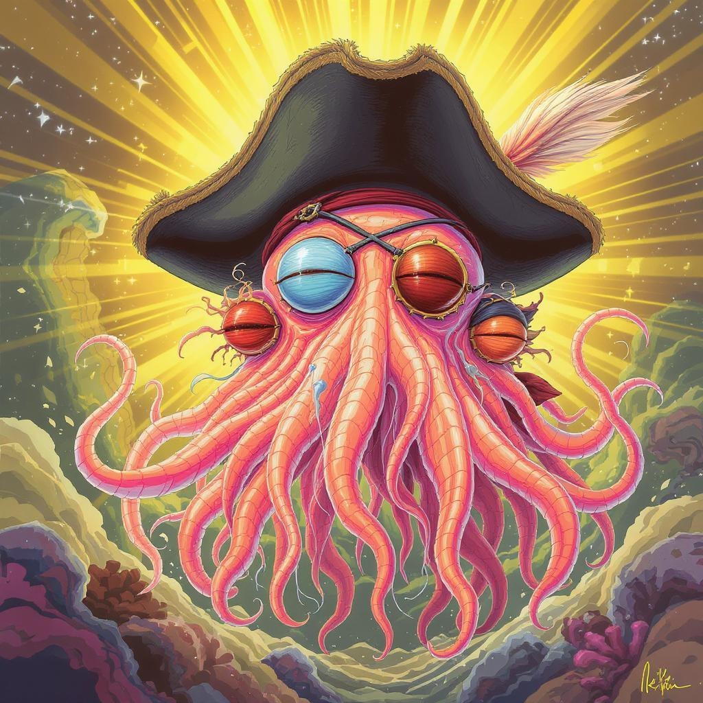 A surreal character design study of an anthropomorphic jellyfish pirate, showcasing multiple heads with a whimsical twist. The portrait is backlit, emphasizing the translucent textures and vibrant colors through intricate light rays. Highly detailed and meticulously crafted, the pirate exhibits an array of charming cartoon features, veering toward vector and clipart styles. The jellyfish's tentacles cleverly mimicking pirate accessories, such as a hat and eyepatch, enhance the quirky distorted aesthetics. This concept is trending on art platforms for its imaginative fusion of sea life and swashbuckling adventure.