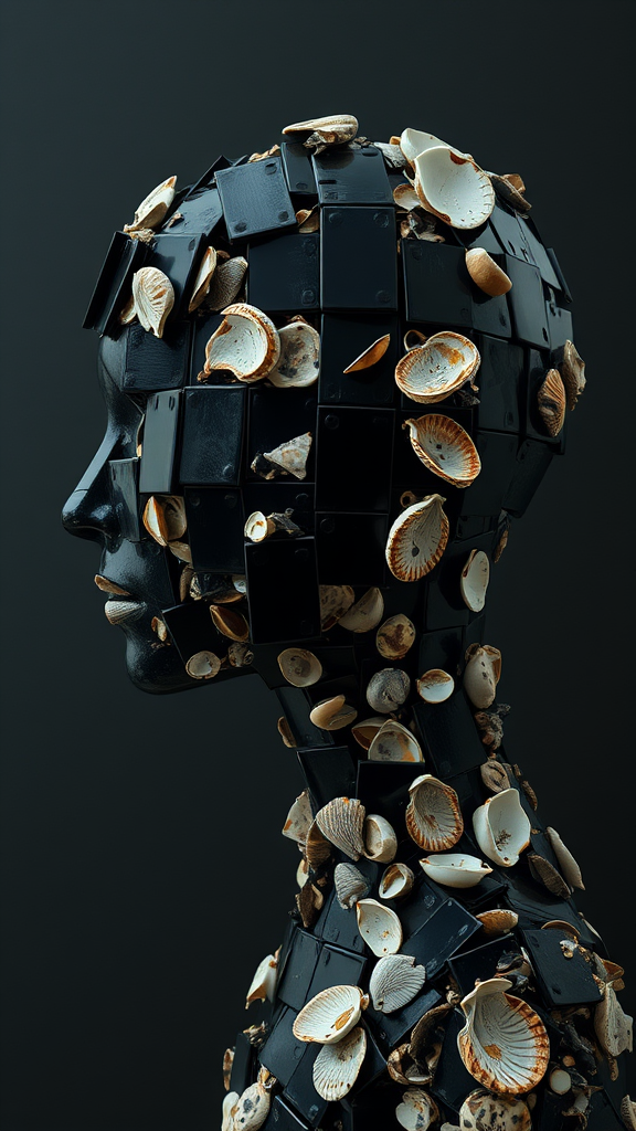 A surreal composition featuring the anatomy of a woman's head crafted from glossy black domino pieces intertwined with shattered sea shells; embodying an Octopath Traveler aesthetic with hints of vanitas. The structure is angular and embodies an altermodern essence, balancing between abstract and realistic with intricate detailing. The scene captures a raw yet captivating visual, merging elements into a cohesive artwork with a 4:5 aspect ratio and a moderate degree of stylized expression.