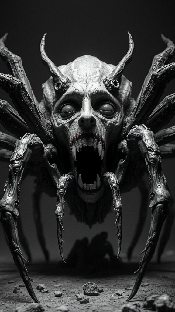 A surreal creature with a human face emerges, its mouth a ghastly portal from which eight spider legs extend, creating a juxtaposition between the eerie and the fantastical. The scene is inspired by the dramatic and intricate works of Gustave Doré, casting a monochrome palette of deep blacks and soft greys. The atmosphere is imbued with an ethereal and haunting magic, illuminated by volumetric lighting that enhances every contour and shadow. This artwork embodies 8k hyper-realism, showcasing an extraordinary level of detail with micro and intricate components that bring the creature to life within a mystical, fantastical setting. The scene captivates with its 3D realism, drawing the viewer into a world where bizarre imagination meets artistic precision.