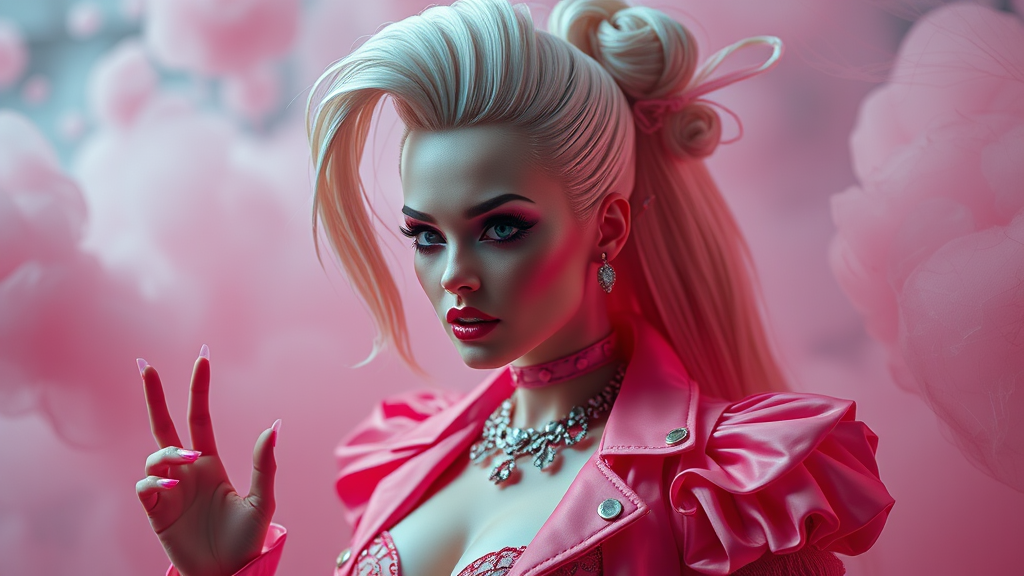 A surreal crossover where Margot Robbie transforms into an ethereal, yet eerie, Barbie-inspired character with a fusion of Pinhead's signature style. She exudes an unsettling yet captivating charm, adorned in a punk pink attire that blends Barbie's iconic fashion with the dark, intricate designs of Hellraiser. The scene is set in a dreamlike dimension, where vibrant pink hues clash with ominous shadows, creating a hauntingly beautiful visual spectacle.