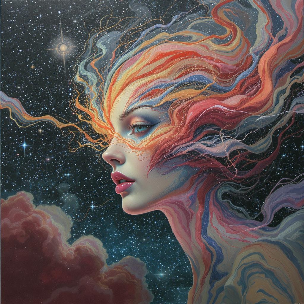 A surreal depiction featuring a woman's head enveloped in a vortex of swirling colors, merging seamlessly into a cosmic landscape. Her features exhibit the intensely colorful figuration synonymous with Aleksi Briclot's style and the ethereal, otherworldly essence of Peter Mohrbacher's work. The scene is rendered with realistic hyper-detail, with elements appearing as if they are splattered or dripped across the canvas, creating a sense of movement and fluidity. The cosmic backdrop amplifies the ethereal quality, as galaxies and nebulae intermingle within the vibrant vortex surrounding the figure. The composition captures a dreamlike transcendence, balancing between the tangible and the fantastical.
