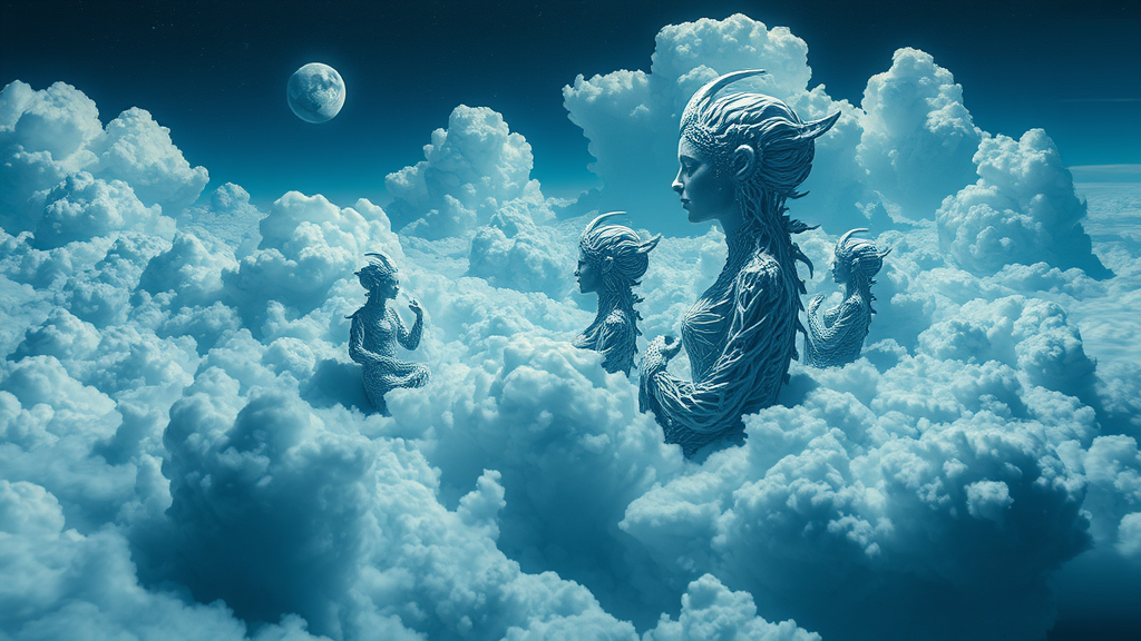 A surreal depiction of a celestial landscape, evoking a world nestled within the clouds, inspired by the artistic styles of Tanya Shatseva and The Stars Art Group, with a touch of Meghan Howland's influence. The scene features an interplay of dark indigo and light cyan hues, creating an ethereal atmosphere. Intricate, mind-bending sculptures rise from the cloudscape, exuding a sense of realistic hyper-detail while maintaining an essence of fluid simplicity. This visual narrative stretches across a vertical canvas, inviting viewers to immerse themselves in its wondrous, dreamlike expanse.