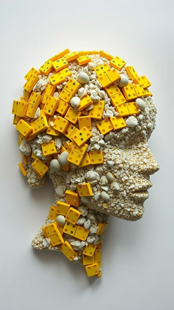 A surreal depiction of a woman's head composed of fluorescent yellow domino pieces interwoven with crushed seashells, evoking a Vanitas style with elements inspired by Octopath Traveler. The structure is angular and reflects an altermodern aesthetic, blending contemporary and historical influences. Embodying a raw and unorthodox style, the composition strikes a balance between the abstract and the tangible, maintaining a sense of mystery and wonder.