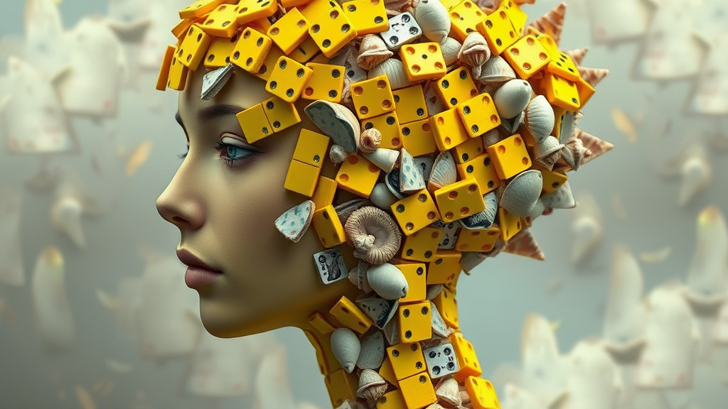 A surreal depiction of a woman's head composed of fluorescent yellow domino pieces intertwined with fragmented sea shells, inspired by the enigmatic landscapes of Octopath Traveler and the contemplative essence of vanitas. The structure exhibits an angular design, embodying the principles of altermodern art with a raw, textured style that accentuates its surreal nature. It balances the delicate intricacy of the dominoes and shells with an imaginative twist, creating an almost ethereal presence against a dreamlike background.