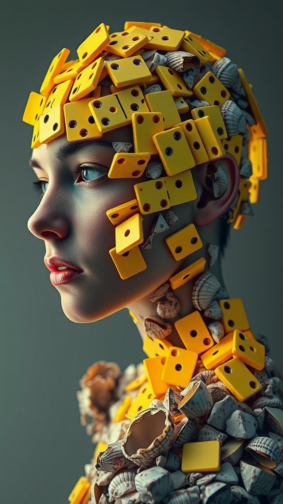 A surreal depiction of a woman's head composed of fluorescent yellow domino pieces intertwined with shattered seashells, inspired by the art style of Octopath Traveler, with vanitas elements. The composition is angular and reflects an altermodern aesthetic, blending realism with abstract forms, capturing both fragility and rigidity. The scene embodies a vibrant yet melancholic tone, incorporating raw textures and intricate details that create an immersive, dream-like experience.