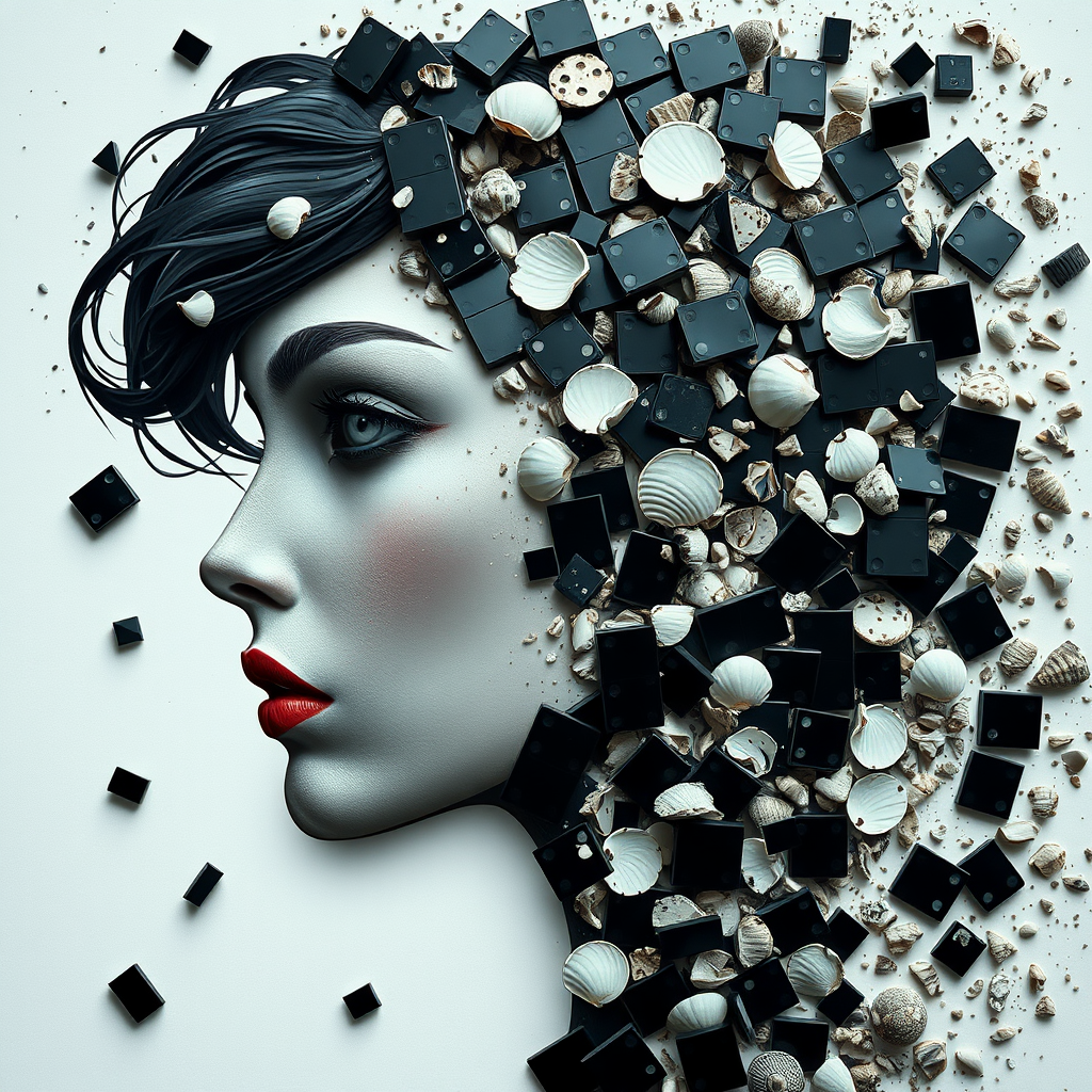 A surreal depiction of a woman's head composed of glossy black domino pieces interwoven with shattered sea shells, inspired by the aesthetic of Octopath Traveler and vanitas. The design is angular and altermodern, capturing a sense of depth and complexity. The piece marries elements of surrealism with a raw, unpolished edge, creating a striking 4:5 aspect ratio visual. Subtle variations in texture and light play across the surface, enhancing the intricate and abstract nature of the composition.
