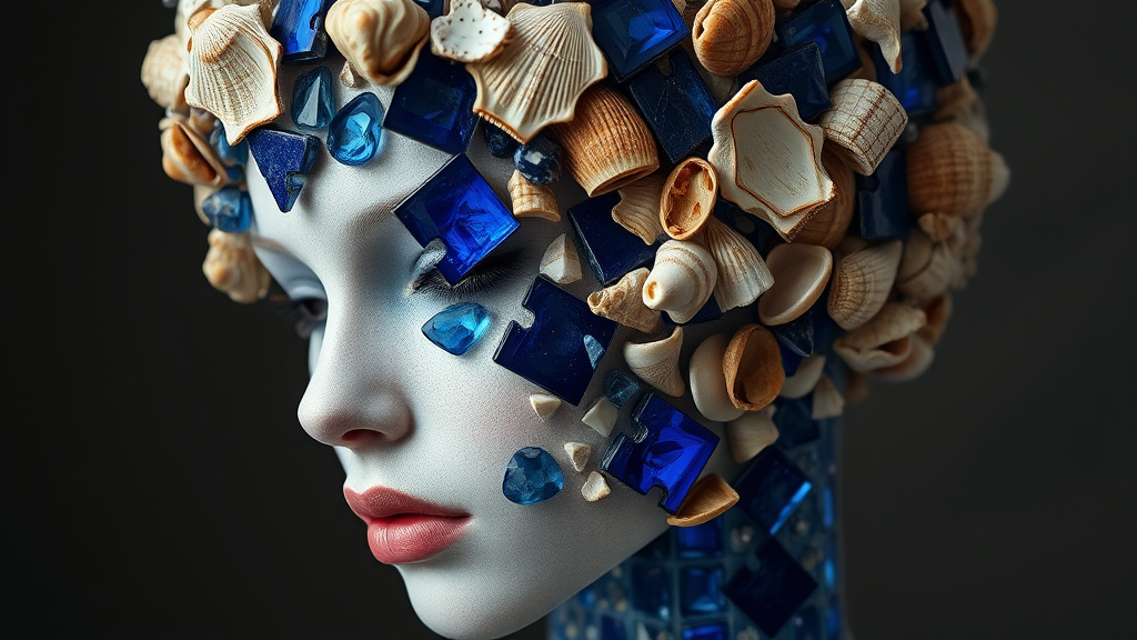 A surreal depiction of a woman's head constructed from angular blue sapphire domino pieces intertwined with fragments of shattered sea shells, reminiscent of the art style in Octopath Traveler. Influenced by vanitas and altermodern themes, this composition presents an intricate mosaic of textures and colors, where the shimmering sapphire contrasts with the organic beauty of the shells. The overall form captures a dreamlike and raw essence, blending reality with imagination in a striking 4:5 aspect ratio.