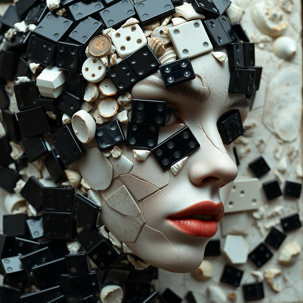 A surreal depiction of a woman's head constructed from glossy black domino pieces and fragmented seashells, inspired by the artistic styles of Octopath Traveler and vanitas. The composition presents angular forms and embraces the altermodern aesthetic, highlighting the contrasts between the smooth, reflective surfaces of the dominoes and the rough textures of the seashells. This raw interpretation conveys a sense of depth and complexity, balancing elegance with abstract elements.