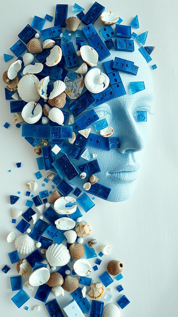 A surreal depiction of a woman's head crafted from blue sapphire domino pieces intertwined with shattered sea shells, inspired by the art of octopath traveler and vanitas. The composition features angular elements and embodies an altermodern aesthetic, with an ethereal and raw style that elevates the dreamlike quality.