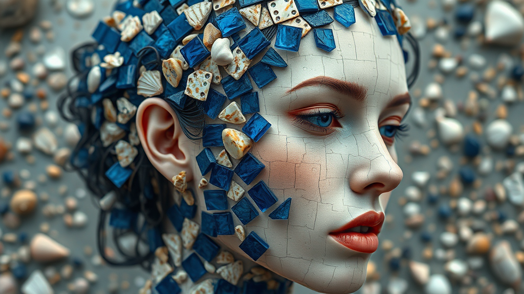 A surreal depiction of a woman's head crafted from blue sapphire domino pieces interwoven with crushed seashells, resembling the art style of Octopath Traveler and vanitas, with an angular and altermodern twist, capturing the eclectic essence of fragmented beauty and timelessness, set against a surreal, dreamlike backdrop. The composition imbues a raw, yet stylized aesthetic, embracing the interplay of texture and color in a mesmerizing tableau.