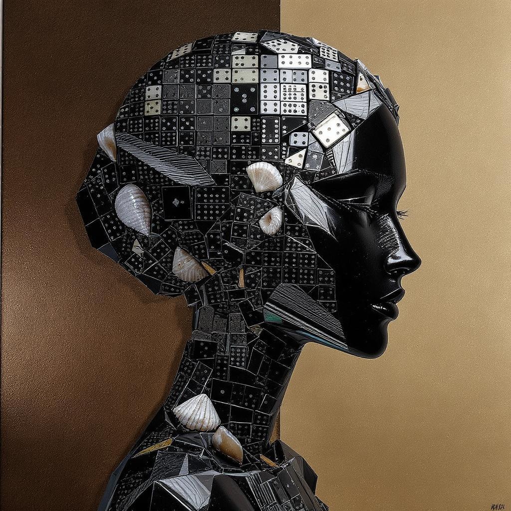 A surreal depiction of a woman's head crafted from a mosaic of shiny black domino pieces intertwined with fragments of smashed seashells, reminiscent of an Octopath Traveler aesthetic. This vanitas-inspired creation features angular contours and embodies an altermodern essence, merging the organic with the abstract. The composition is detailed and intricate, presenting a raw style that embodies both elegance and chaos, capturing the ephemeral nature of beauty and decay.