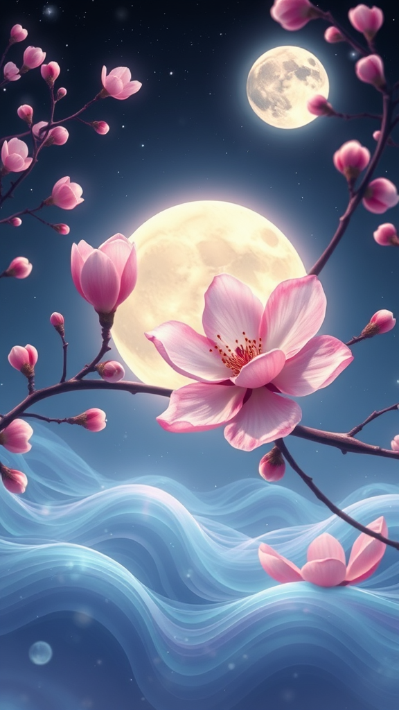 A surreal digital illustration of a plum blossom with a luminous moon in the background, blending the dreamlike qualities of George Lacom and James A. R. Izzy's styles. The scene is set in an autumn night, inspired by the calming essence of Marin and Ji Sheng, evoking Shen Shichong's luminous and ethereal touch. The artwork captures the vivid contrasts of light and shadow, presenting a multi-layered vista with fractal thunder inspired by Dan Mumford and psychedelic surrealism akin to Alex Gray. This intricately woven design resembles an astral plane with infinite psychedelic waves, embodying the optical illusion artistry of Amédée Ozenfant and Cyril Rolando. It features an authentic ripple structure, presenting a cosmic realm where color and imagination coalesce into an extraordinary, dreamlike narrative.