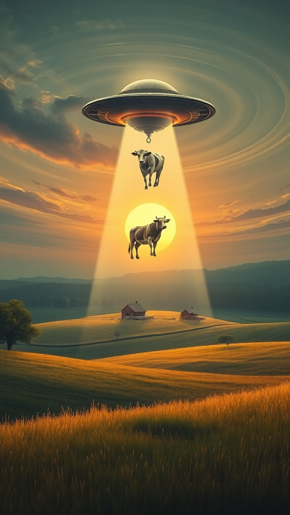 A surreal, dreamlike landscape featuring a cow suspended in a gentle, luminous beam beneath a UFO, hovering ethereally above the tranquil fields of a rural farmhouse in the distance. The scene is bathed in a soft, otherworldly light, evoking a sense of peaceful meditation and zen-like calmness. The landscape merges elements of ethereal fantasy with the bold, emotive strokes reminiscent of Die Brücke's style, creating a harmonious blend of fictional and surrealist imagery. The sky is a tapestry of swirling colors, adding to the mystical ambiance, and the setting sun casts long, whimsical shadows across the rolling hills, enhancing the enchanting, otherworldly atmosphere.