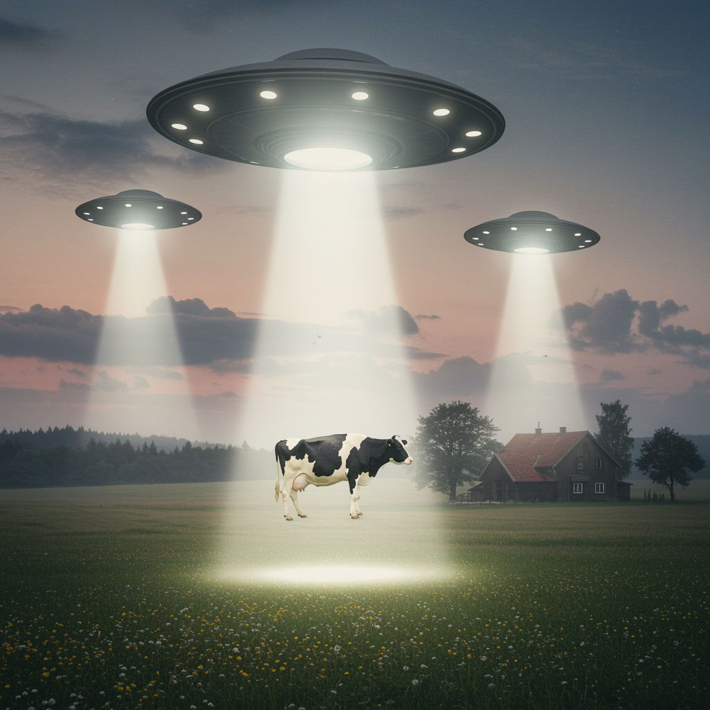 A surreal, dreamlike landscape where a cow hovers gently in a luminous beam beneath a UFO, floating several feet above a tranquil rural farmhouse. The scene is rendered in a photo-realistic style, imbued with ethereal fantasy and zen-like calmness. The landscape captures a blend of Die Brücke's expressive colors and surrealist dream imagery. In this fictional setting, the serene natural beauty of the countryside is contrasted with the mystical presence of the hovering objects, creating an atmosphere of wonder and curiosity.