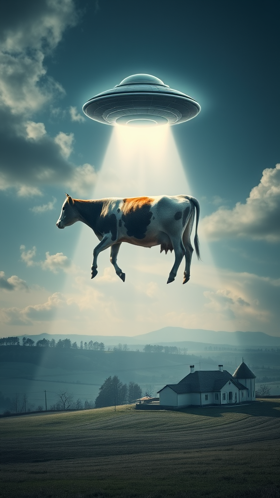 A surreal dreamscape featuring a cow gently levitating in a shimmering beam beneath a UFO, the scene glowing with ethereal light over a tranquil rural farmhouse. The composition blends photo-realistic landscape elements and fantastical tones, with a Zen-like tranquility and a dash of Die Brücke's bold expression. The landscape bends into a fictional terrain, where serene fields merge with surrealist visions, creating a dreamlike image that enchants and mystifies, the cow in mid-air embodying the calm essence of an otherworldly narrative.