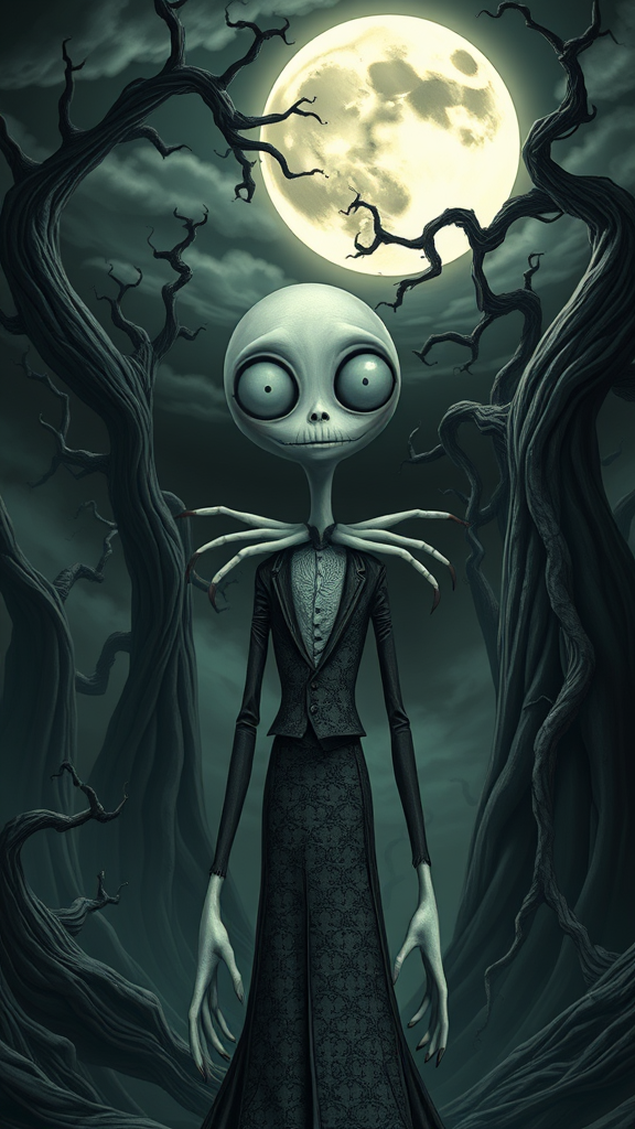 A surreal, eerie anime character with exaggerated, elongated features in Tim Burton's signature style stands against a shadowy, twisted landscape. The character has large, expressive eyes that seem almost too wide, conveying a sense of mystery. Their pale, porcelain-like skin contrasts with the dark, swirling environment around them. The figure's attire is a blend of Victorian and fantastical elements, with intricate patterns and a flow that defies gravity. Despite the unsettling proportions and angular limbs, the character maintains a gothic charm. The scene is rendered in ultra-high definition (UHD) with high dynamic range (HDR) technology, bringing out the vivid contrasts and intricate details. The background features towering, crooked trees, and a sky lit by an oversized, luminescent moon, emphasizing the dark whimsy of this 16K resolution artwork.