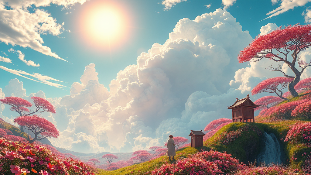 A surreal environment capturing the essence of a dream with a burst of vibrant colors under the dramatic midday sun. This large-scale, hyperrealistic scene is rich in detail with realistic lighting, invoking the style of WLOP and Artgerm. Rendered in octane, the artwork emulates trending pieces on ArtStation and draws inspiration from Studio Ghibli's enchanting world, crafted in ultra-high definition with HDR10 quality. The composition combines the allure of fantastical realism with a touch of whimsy, expertly avoiding common pitfalls like poor anatomy or awkward proportions, and devoid of any blurriness or distorted forms. The vivid landscape and character interactions are harmonious and intricately designed, free from any disfigurements or extraneous elements, showcasing artistic finesse with captivating and coherent proportions throughout.