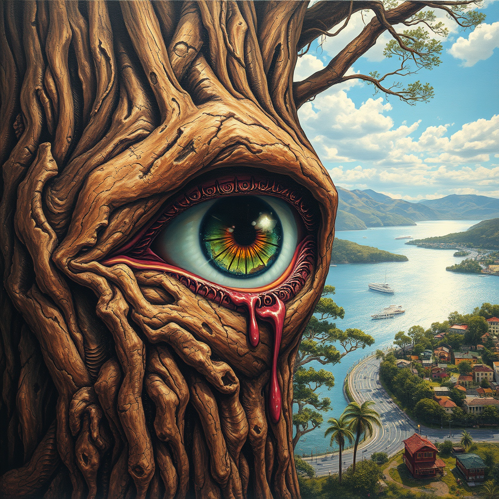 A surreal eye embedded in the bark of an ancient tree near a shimmering lake, painted in the style of Brian Despain, with vibrant colors dripping like fresh paint against an expansive landscape. The scene unfolds into a highly detailed urban environment that bends reality, echoing the mystique of Mars Ravelo's storytelling and the intricate textures of Mati Klarwein's visions. The tableau captures the otherworldly fusion of nature and urban life, where dreamlike elements float seamlessly in and out of view.