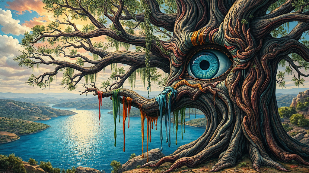 A surreal eye nestled within the bark of a sprawling tree overlooking a shimmering lake, painted in the style of Brian Despain, cascades of vibrant paint dripping down its trunk. This scene unfolds within an expansive landscape that merges with intricate, surrealistic elements of an urban dreamscape. Influences of Mars Ravelo and Mati Klarwein echo throughout, with the tree rooted in a land that feels both alien and familiar, evoking a sense of wonder and mystery under a sky brushed with colors of imagination.