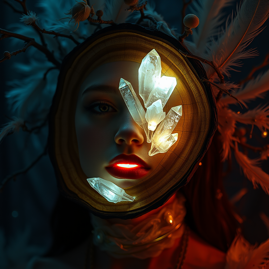 A surreal fashion photograph featuring a wooden slice crafted from glowing crystals, illuminating a person's face, adorned with intricate fine feather details. The scene is infused with organic, nature-inspired forms, showcasing a strong contrast between light and dark, entwined with ephemeral installations. Detailed depictions of nature elements weave through the composition, enhancing the enchanting and otherworldly ambiance.