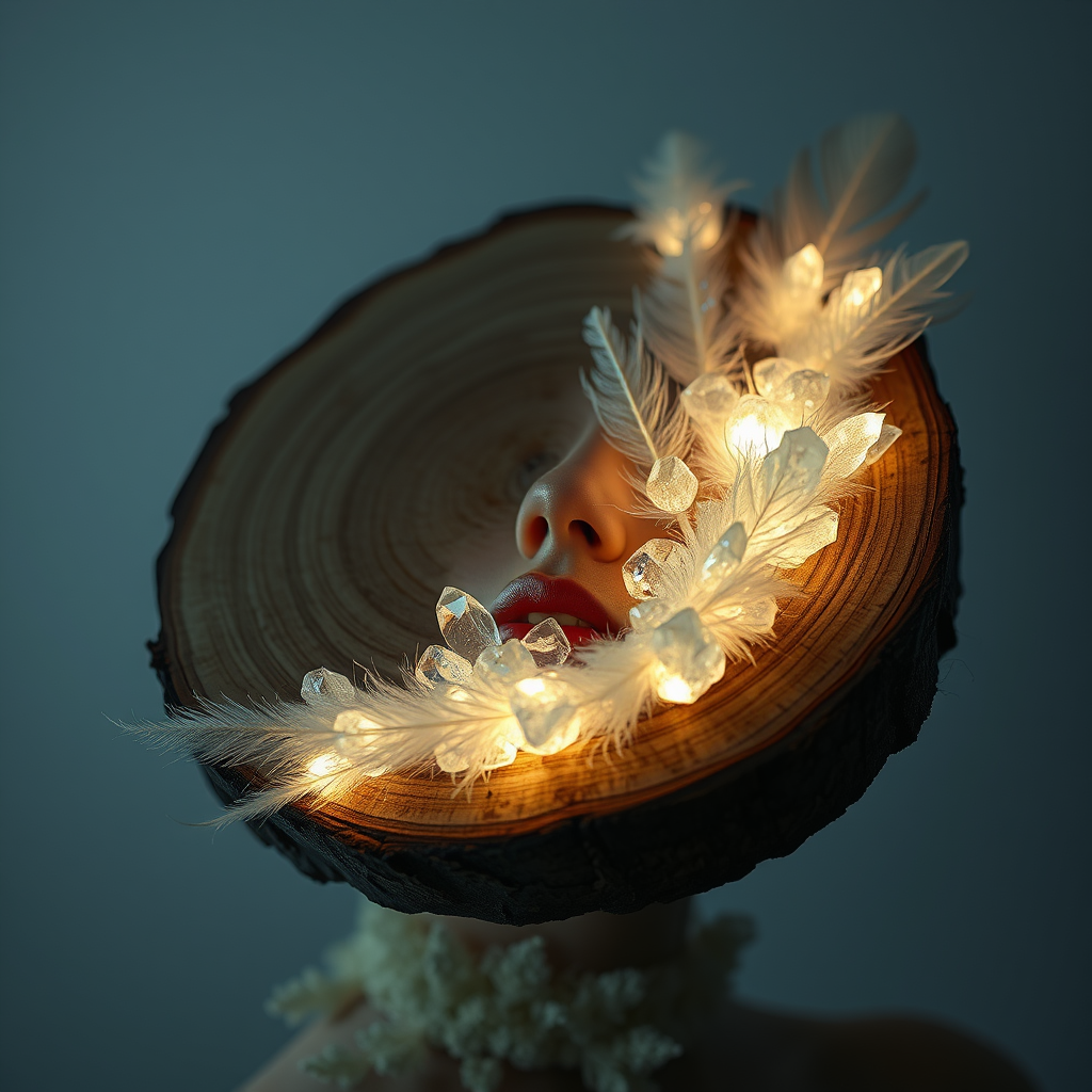 A surreal fashion photograph featuring a wooden slice crafted from glowing crystals, with a person's face gently illuminated. The image incorporates detailed, fine feather-like elements and organic, nature-inspired forms that highlight the strong contrast between light and darkness. It presents ephemeral installations with intricately detailed depictions of nature, maintaining a dreamlike quality throughout. The composition captures the interplay between natural textures and ethereal light, bringing a fusion of art and nature to life with subtle creative flourishes.