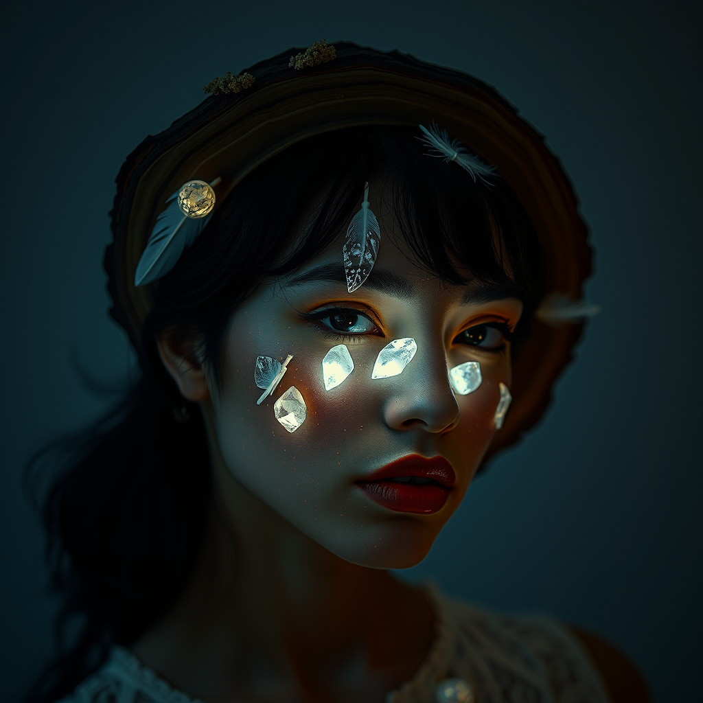 A surreal fashion photograph featuring a wooden slice embedded with glowing crystals, illuminating a person's face with fine feather details. The composition blends organic nature-inspired forms, showcasing a strong contrast between light and dark, and highlights ephemeral installations. Detailed nature depictions embellish the scene, capturing a dreamlike essence and emphasizing the interconnection between the individual and the natural elements. The scene is crafted in a manner that amplifies surreal beauty and harmony, with subtle creative twists that enhance the original concept.