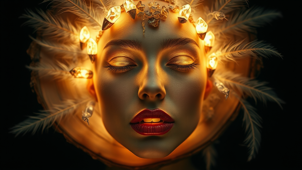 A surreal fashion photograph featuring a wooden slice interwoven with glowing crystals, illuminating a person's face. The image is rich with fine feather details and organic, nature-inspired forms, creating a striking contrast between light and dark. Ephemeral installations and intricate depictions of nature enhance the surreal atmosphere, capturing a dreamlike yet vivid scene.