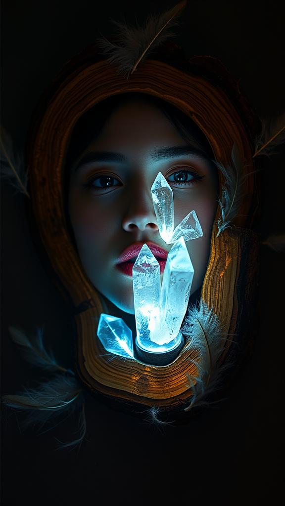 A surreal fashion photography piece featuring a wooden slice embedded with glowing crystals illuminating a person's face; fine feather details and organic, nature-inspired forms surround the composition, creating a strong contrast between light and dark. Enjoy ephemeral installations and detailed depictions of nature, maintaining an air of mystery and beauty. The scene is ethereal, capturing the essence of nature's elements intertwined.