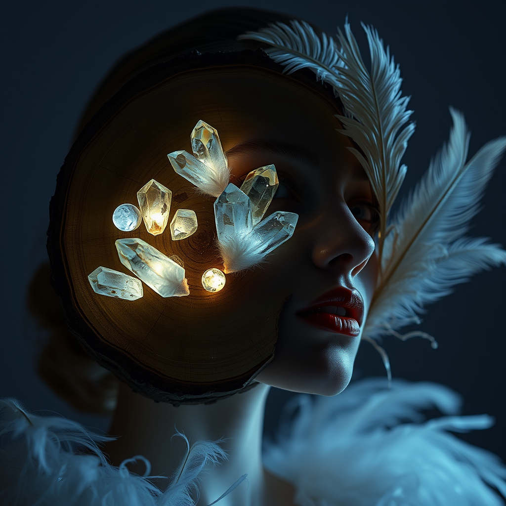 A surreal fashion photography piece featuring a wooden slice embedded with glowing crystals illuminating a person's face, highlighting fine feather details and organic nature-inspired forms. The composition contrasts light and dark with ephemeral installations and intricately detailed depictions of nature, providing a mystical and ethereal atmosphere. The artwork embodies a dreamlike quality blending natural elements with a heightened sense of couture.