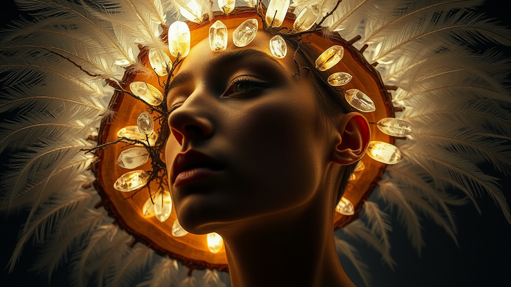A surreal fashion photography scene featuring a wooden slice embedded with glowing crystals, illuminating a person's face. This ethereal composition blends fine feather details with organic, nature-inspired forms, creating a striking contrast between light and dark. The ephemeral installation showcases intricate depictions of nature, embodying a dreamlike atmosphere, while the glowing crystals cast a mystical aura around the subject, highlighting delicate textures and soft contours.