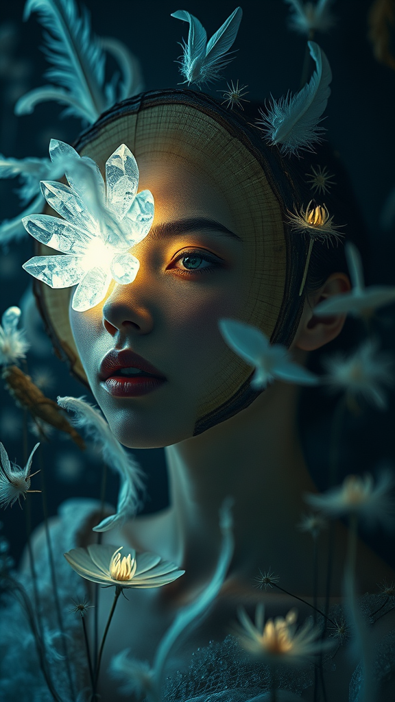 A surreal fashion photography scene featuring a wooden slice composed of glowing crystals, casting an ethereal light over a person's face. The image includes fine feather details and incorporates organic, nature-inspired forms, creating a stark contrast between light and dark. Ephemeral installations surround the figure, with intricate nature depictions adding depth and complexity to the scene. The atmosphere is dreamlike and imaginative, slightly altered to enhance the mysterious and otherworldly vibe, evoking a sense of wonder and curiosity.