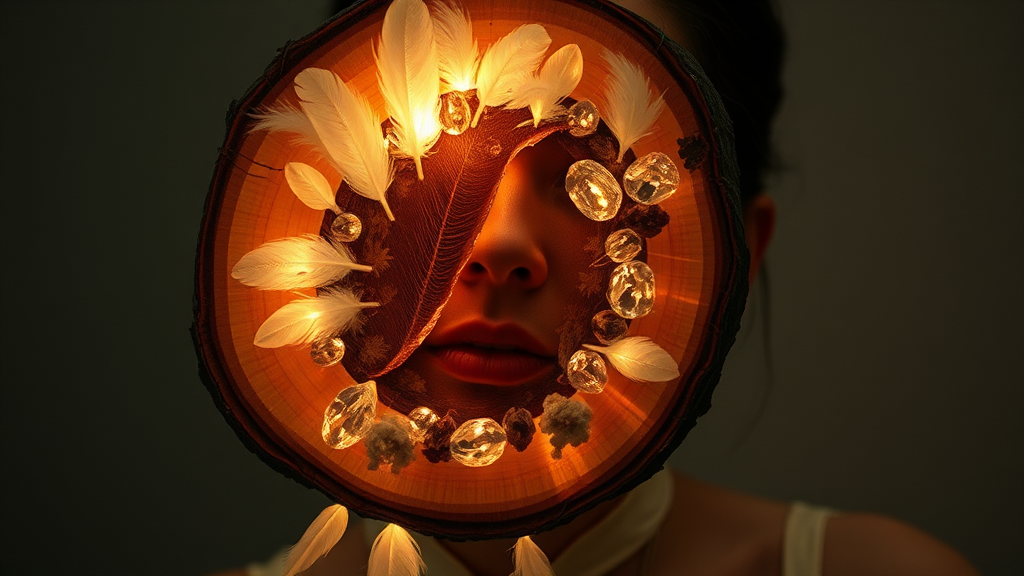 A surreal fashion photography scene featuring a wooden slice crafted from glowing crystals, casting an ethereal light on a person's face. Fine feather details intertwine with organic, nature-inspired forms, showcasing a strong contrast between light and shadow. This ephemeral installation blends intricate nature depictions with a dreamlike ambiance, capturing the essence of glowing elegance and artistic whimsy.