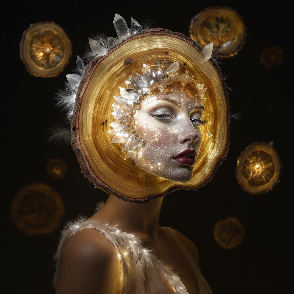 A surreal fashion portrait featuring a wooden slice crafted from luminous crystals, casting a radiant glow on a person's face, framed in fine feather details. The composition embodies organic, nature-inspired forms with pronounced contrasts of light and shadow. Ephemeral installations surround the scene, capturing intricate depictions of nature, creating a dreamlike atmosphere and engaging the viewer's imagination through its surreal intricacies and ethereal beauty.