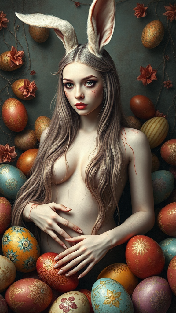 A surreal full-body portrait of a woman with rabbit-like features surrounded by colorful, intricately decorated eggs. Her long, flowing hair cascades down her shoulders, laced with crimson streaks resembling blood, adding an edgy contrast to her ethereal appearance. She stands gracefully amidst the vibrant eggs, embodying a mystical and mysterious presence that merges the innocence of a bunny with the allure of a femme fatale.