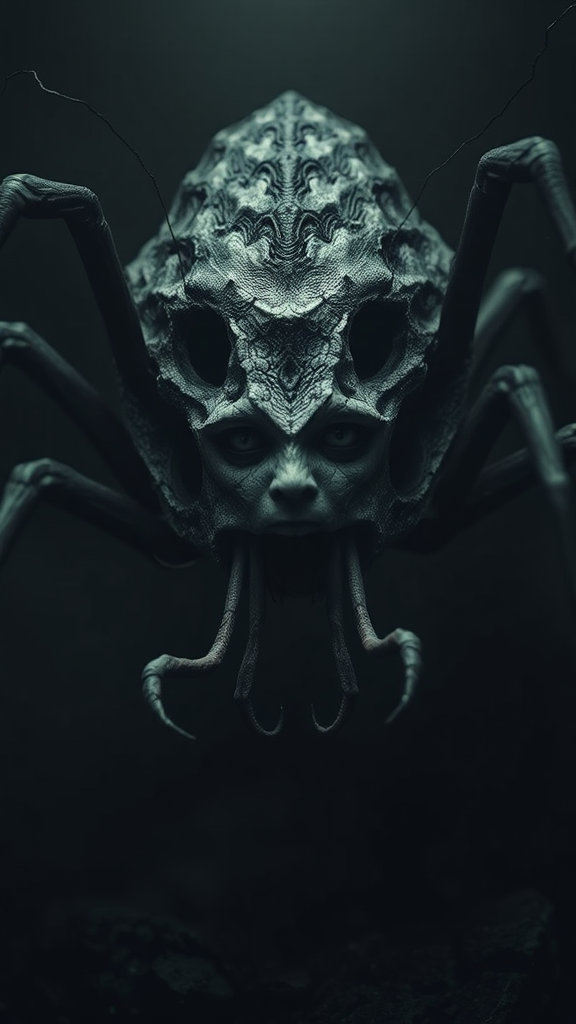 A surreal hybrid being with a human face emerging from the center, surrounded by elongated, delicate spider legs sprouting from its mouth, set in an eerie, Gothic-inspired scene reminiscent of Gustave Doré's work. The atmosphere is steeped in dramatic shadows and tension, with black and grey tones enhancing a sense of unease. The environment is intricately crafted, showcasing an enchanting yet unsettling magic aura with hyper-realistic textures and micro details. The composition is brought to life through volumetric lighting and a strong emphasis on 3D realism, creating a striking visual narrative that is both fantastical and hauntingly vivid, capturing every nuanced detail in an 8k resolution.