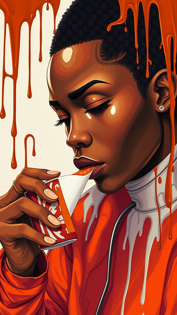 A surreal illustration of a figure savoring their coffee, with vibrant pop colors and a juxtaposition of dark amber and white tones. The image uses a paint dripping technique to create a fluid, dynamic scene. It blends elements of Afrofuturism, showcasing sleek, futuristic designs interwoven with rich cultural motifs. The figure's features are captured in realistic portraiture, giving depth and emotion to the scene. The composition has a poured effect, blurring the boundaries between reality and fantasy, with an elongated aspect ratio of 8:11 and a creativity setting of 750.