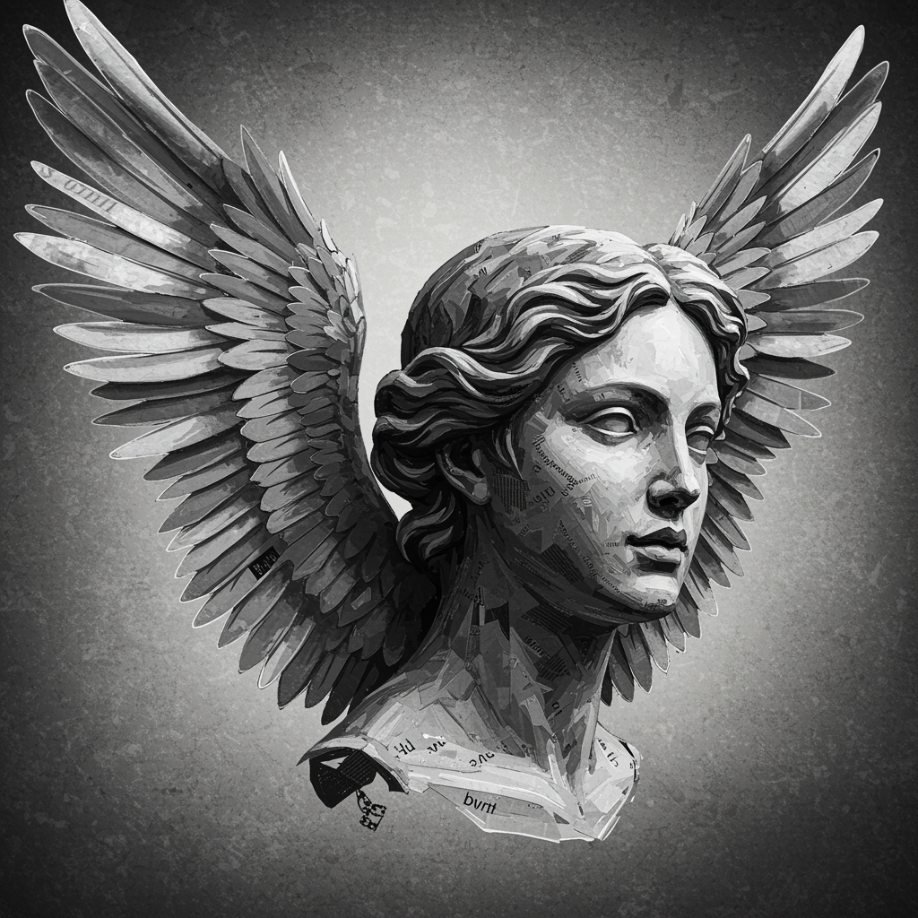 A surreal illustration of an angel's head, intricately detailed, with wings crafted from a collage of paper in various monochrome shades of grey. The textured background enhances the depth of the composition, creating a dreamy atmosphere. Soft edges and nuanced lighting effects give the artwork a sense of ethereal depth, while subtle abstract elements bring a contemporary digital art style to the piece, maintaining its otherworldly essence.