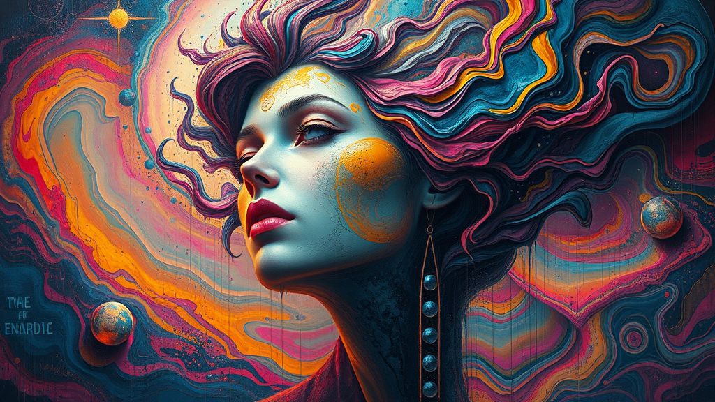 A surreal image featuring a woman's head surrounded by swirling colors, blending the cosmic landscapes of Aleksi Briclot and the intensely colorful figuration of Peter Mohrbacher, with hyper-realistic detail. The scene is vibrant and dynamic, with splattered and dripped elements adding to the surreal atmosphere, reminiscent of a cosmic dreamscape with ethereal textures.