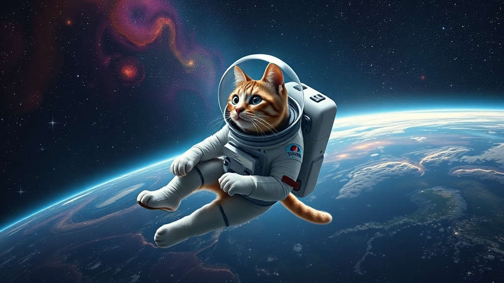 A surreal image of a cat, wearing a sleek astronaut suit, elegantly floating through the vastness of space, surrounded by glittering stars and colorful nebulae, embodying an adventurous spirit and cosmic curiosity, while Earth shimmers in the distance under the soft glow of distant galaxies.