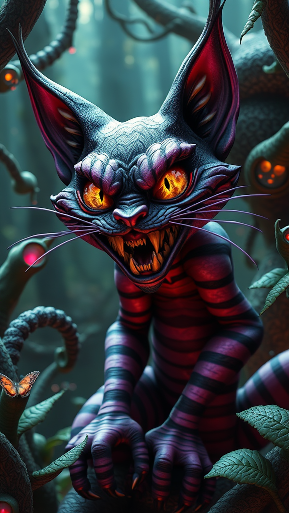 A surreal interpretation of a fractal-themed Cheshire Cat lurking in the enchanted forest of Alice in Wonderland, with a mystical and otherworldly ambiance. Its sinister grin echoes with an evil laugh, capturing the essence of a villainous portrait. This creature is envisioned in fractalcore style, showcasing a dynamic stance with a fit and robust build, yet its gorgeous form retains the iconic allure of the perfect Cheshire. Rendered with hyper-realistic details, the portrayal combines elements of kawaii and is intricately crafted through zbrush techniques, with hyper-realistic oil painting effects and expertly contoured shading enhancing its eerie beauty.