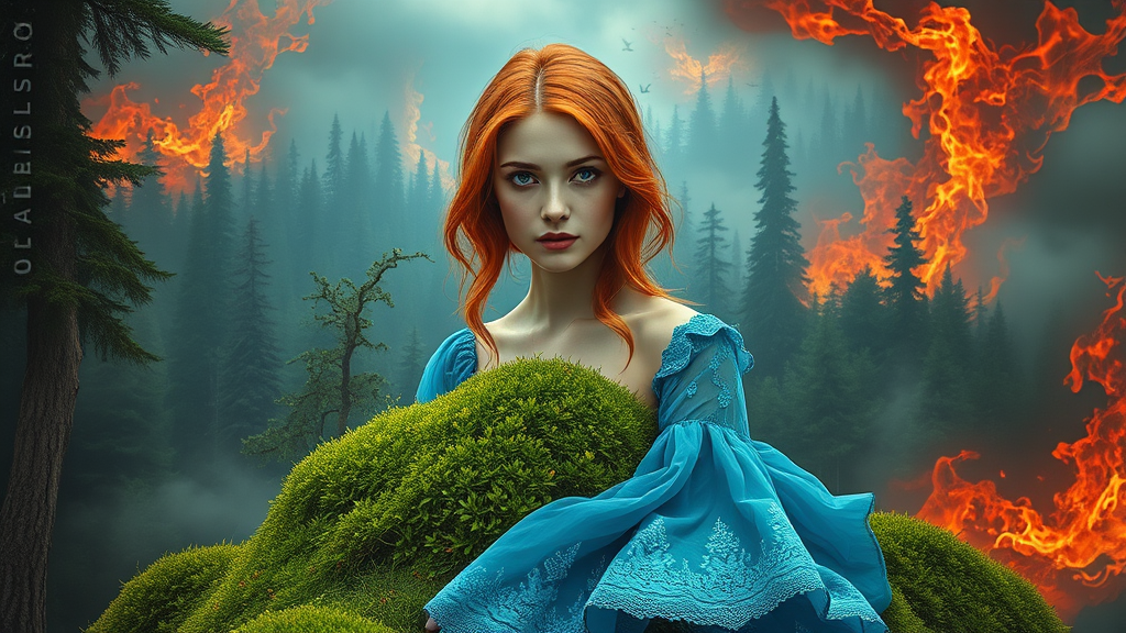 A surreal landscape blends the mystique of a fantasy forest with the fiery essence of Dante's inferno. The scene centers on a portrait of an exotic, enchanting Nordic girl with striking red hair. Her face is perfectly detailed with symmetric hazel eyes that captivate, and her delicate feet rest gently on the summit of a lush, verdant hill within this fantasy realm. She wears an elegant blue lace flowy dress that complements her ethereal presence. Rendered with meticulous detail and cinematic grandeur, the scene boasts hyperrealistic qualities akin to a stunning photograph or a 3D render. The composition, inspired by the likes of Mucha, Klimt, and Erte, presents an intricate artwork masterpiece with an ominous yet epic tone. The vibrant colors and ultra-high resolution make it a striking piece, reminiscent of art featured on prominent platforms like ArtStation and Behance. The overall image exudes a sense of stylized digital art, seamlessly blending elements of fantasy and dark allure, crafted with smooth precision and UHD clarity.