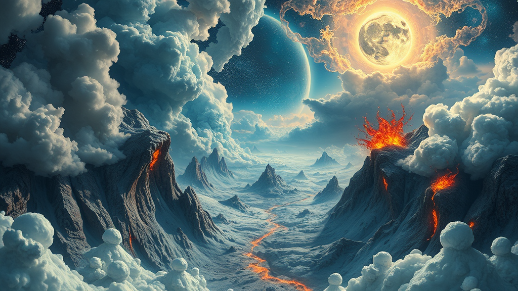 A surreal landscape depicting a world within a world, showcasing five intricately detailed realms viewed from a celestial vantage point; a cosmic tapestry intertwines heaven and hell, merging ethereal beauty with infernal chaos, each with unique textures, vibrant colors, and mesmerizing detail.