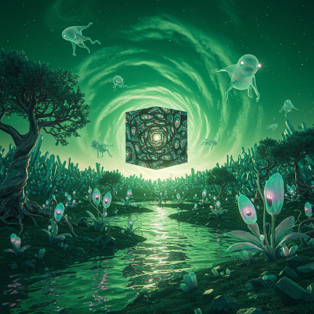 A surreal landscape unfolds under a swirling emerald sky, where translucent creatures with luminescent eyes drift above a twisted forest of metallic trees. In the distance, a colossal, pulsating cube hovers ominously, reflecting bizarre patterns across the landscape. Strange, iridescent plants with whispering voices line a shimmering, liquid crystal river. The air is filled with an eerie hum, as if the very fabric of reality is resonating with an unknown frequency, casting everything in an ethereal, otherworldly glow.