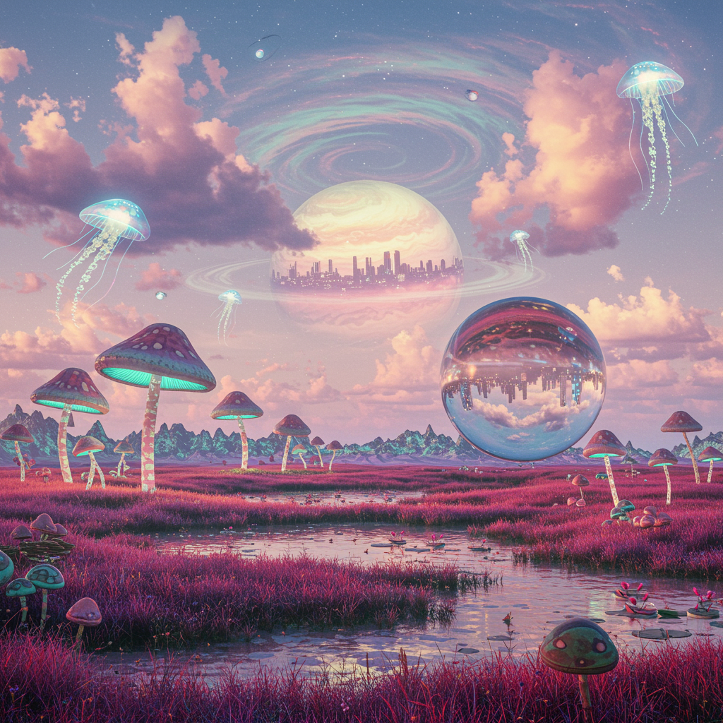 A surreal landscape unfolds, where towering, iridescent fungi sprout from a neon-hued marsh. In the sky above, luminescent jellyfish-like creatures drift through a swirling vortex of pastel-colored clouds, casting eerie shadows on the ground below. Strange mechanical insects buzz around, their metallic wings whirring with an eerie hum, while a massive, translucent sphere floats serenely, reflecting distorted images of an alien cityscape teeming with motion. The air is filled with a haunting melody, as if the planet itself sings an unsettling lullaby, creating an atmosphere both mesmerizing and unsettling, like a forgotten dreamscape from a parallel universe.