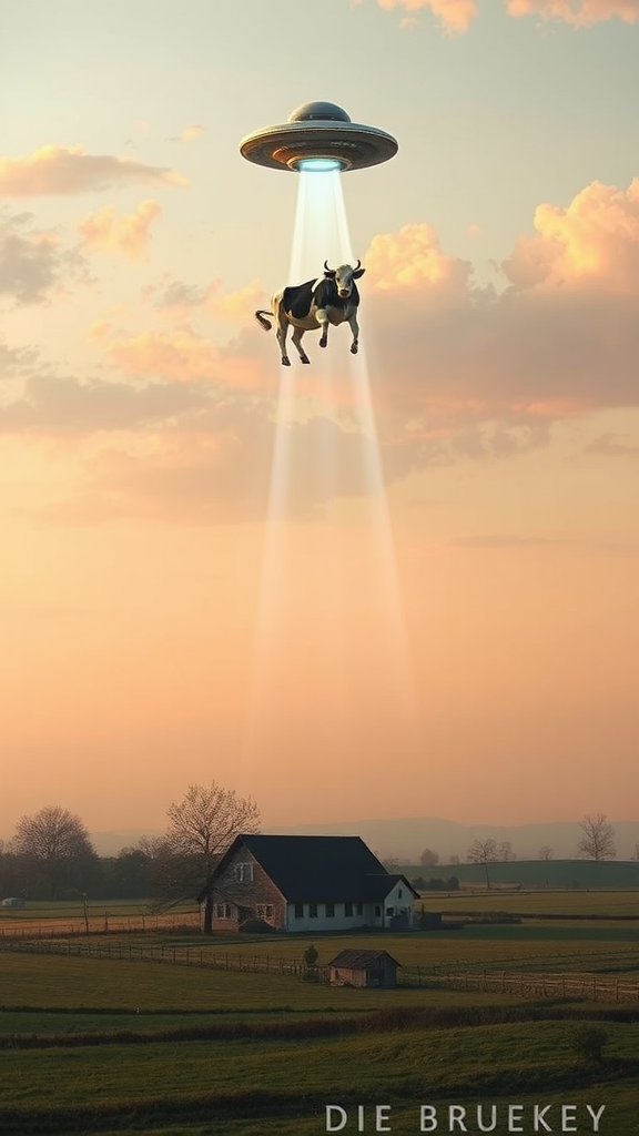 A surreal landscape unfolds with a photorealistic depiction of a tranquil countryside. In the foreground, a serene rural farmhouse nestles amid lush fields, while the early evening sky casts a golden hue over the scene. Suspended several feet above the ground, a cow gracefully hovers in a delicate luminescent beam extending from a mysterious UFO, hovering silently in the sky above. The scene is imbued with an ethereal, dreamlike quality, merging elements of fantasy with the peace of zen-like tranquility. The atmosphere reflects the bold colors and emotional intensity reminiscent of Die Brücke, while the landscape remains fictional and subtly surreal, evoking the imagination's boundless possibility, all framed in a harmonious 2:3 aspect ratio.