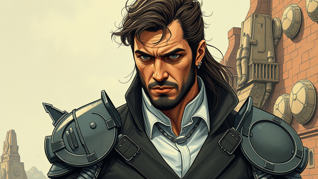 A surreal male character design from a Krull-inspired movie, blending the intricate line work of Sergio Toppi and the elegant Art Deco touches of George Barbier, infused with sci-fi motifs and a hyperrealistic yet minimalist style. The character embodies a rebelcore aesthetic, exuding a raw, photorealistic presence. His attire combines futuristic armor with classic tailored elements, textured and detailed in a way that highlights a sense of rebellion and strength. His face is defined by sharp features, evoking a sense of mystery and defiance, set against a backdrop that suggests an otherworldly, dreamlike landscape.