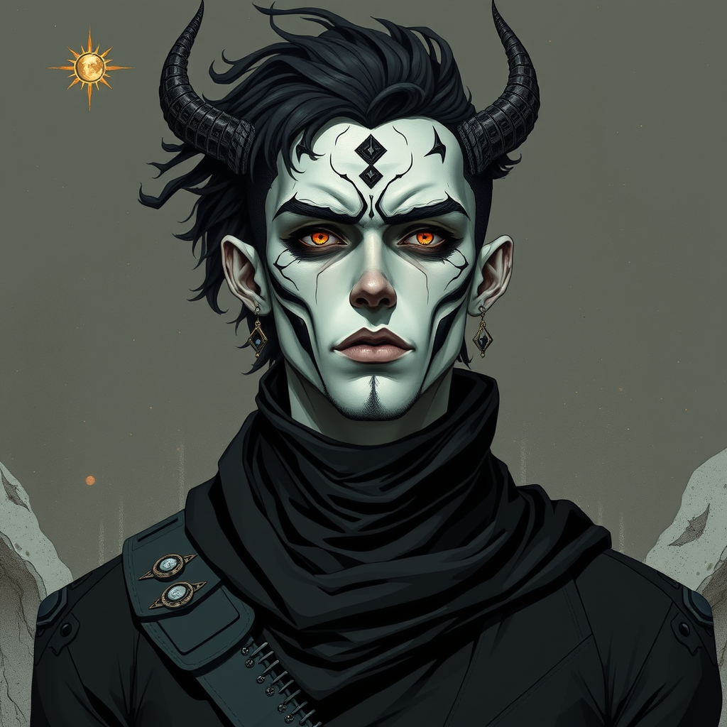 A surreal male character design inspired by Krull, blending Sergio Toppi and George Barbier styles, featuring sci-fi motifs, rebelcore attitude, and elements of hyperrealism, minimalism, and photorealism. The character embodies a rebellious spirit with intricate detailing and a raw, futuristic aesthetic, adorned in minimalist yet striking attire that emphasizes bold and fluid forms, set against a cosmic backdrop with subtle surreal elements.