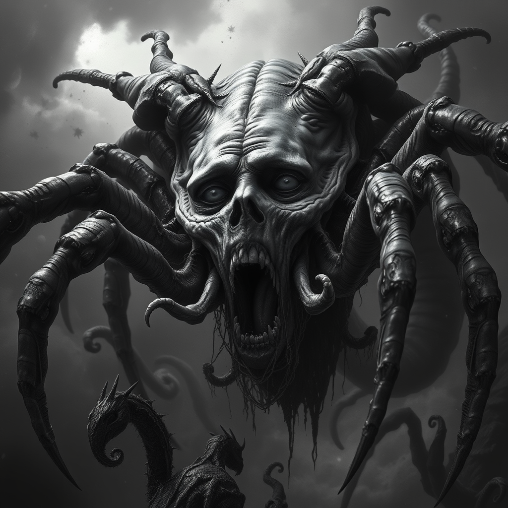 A surreal mutant creature with a human face emerging from the center, spider-like legs protruding from its mouth, set in an eerie, ominous atmosphere. Rendered in the style of Gustave Doré, the scene unfolds in dramatic black and grey tones, evoking a sense of dread and wonder. The atmosphere pulses with a magical, almost otherworldly presence. Crafted in 8k for maximum detail, the image showcases hyper-realistic and intricate micro-details, accentuated by volumetric lighting that hints at a fantasy realm. The illustration embodies a sense of detailed, bizarre realism, creating a haunting yet mesmerizing vision.