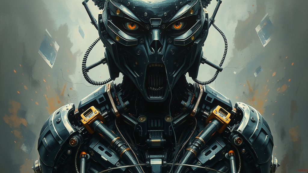 A surreal oil painting depicting a front view of an upper body, showcasing a mechanical human in a sci-fi, dystopian world. The figure exhibits a bizarre and intricate design, with heavy brushstrokes emphasizing a blend of black and chrome elements. The gaze is intense, embodying Tsutomu Nihei's artistic influence, conveying a sense of horror and many layers of detail. The composition displays ultra-realistic textures of real paint, capturing the unsettling essence of a world touched by chaos. The artwork maintains a raw style, with an elongated aspect ratio of 9:16, and is stylized to evoke a sense of striking realism within a nightmarish universe.